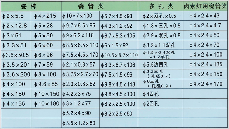 配套内热式电烙铁瓷管15W--80W各规格,燃气热水器加温陶瓷管,卤素灯陶瓷管,高精密电阻基体,电机瓷轴,纺织瓷棒等。多孔陶瓷管广泛用于仪表配件,具有耐高温耐高压,耐磨性能好等特点。